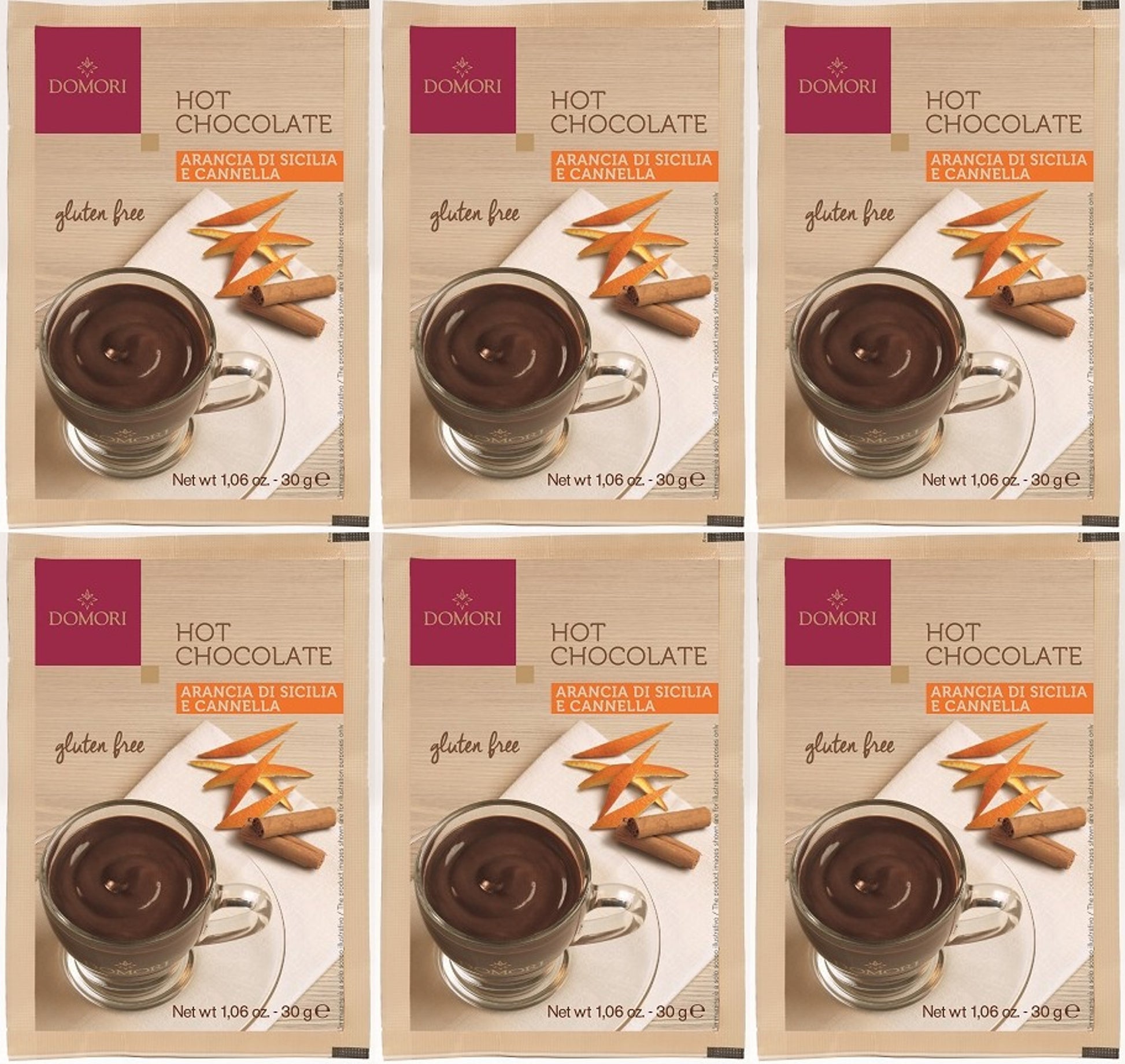 Domori Gluten Free Hot Chocolate Sachets - Sicilian Orange and Cinnamon (Pack of 6, 6x30g)