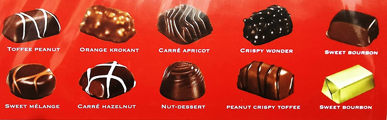 - This 10 Assortment collection includes Toffee Peanut, Orange Krokant, Carre Apricot, Crispy Wonder, Sweet Bourdon, Sweet Melange, Carre Hazelnut, Nut Dessert, Peanut Crispy Toffee and Golden wrapped Sweet Bourdon a journey back in time with our colourful chocolate figurines and end your voyage with our melting chocolate.