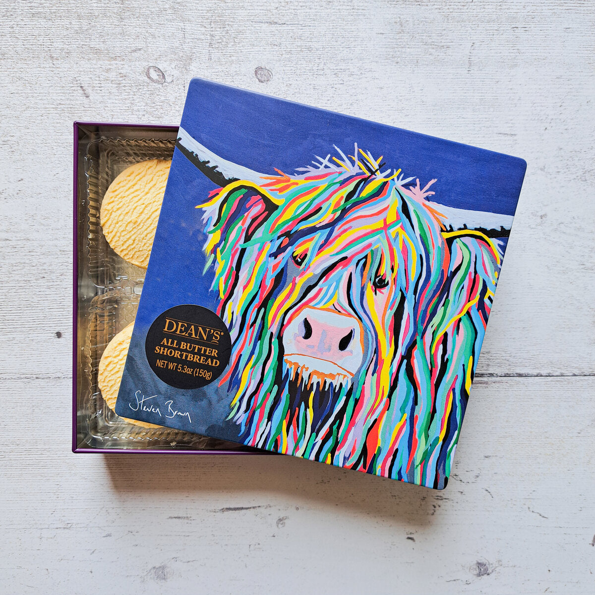 Our Steven Brown Art Kev McCoo tin is filled with delicious all-butter shortbread rounds, slowly hand-baked for a rich buttery taste and the perfect melt-in-the-mouth texture.
