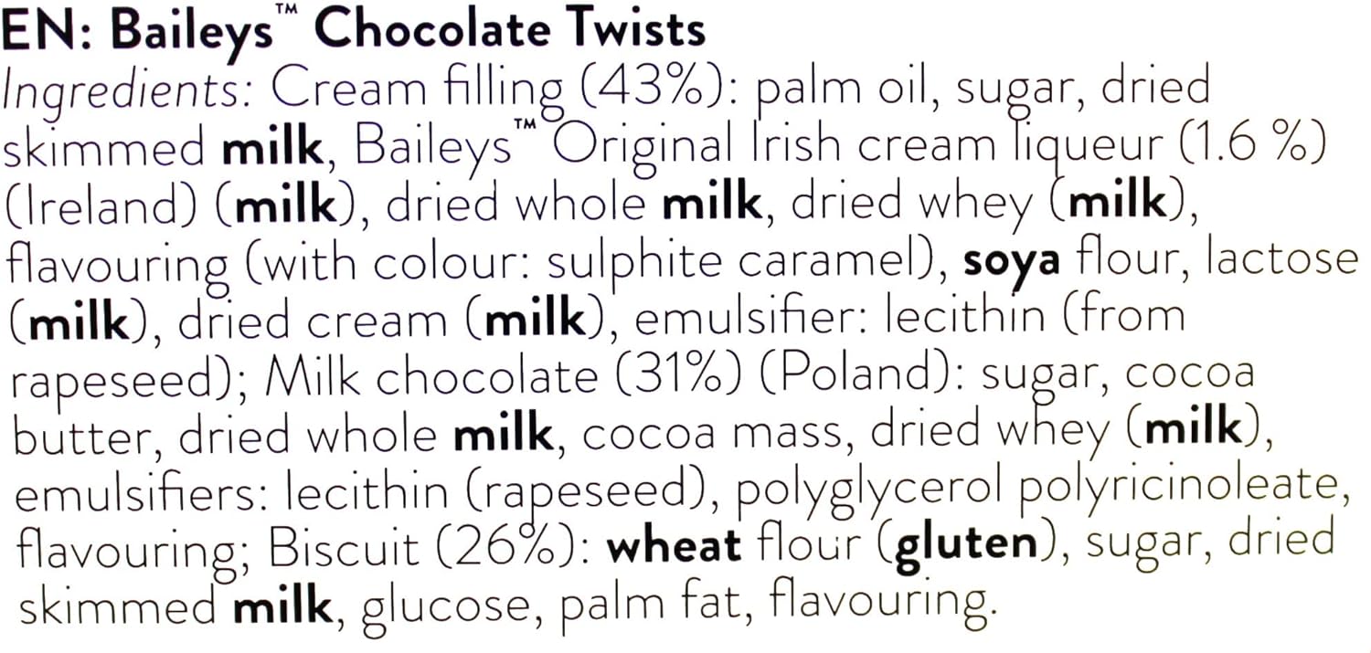 Pack of 2 x 107g of light and crispy ganache filled chocolate wafers twist infused with Baileys Original Irish Cream Liqueur.