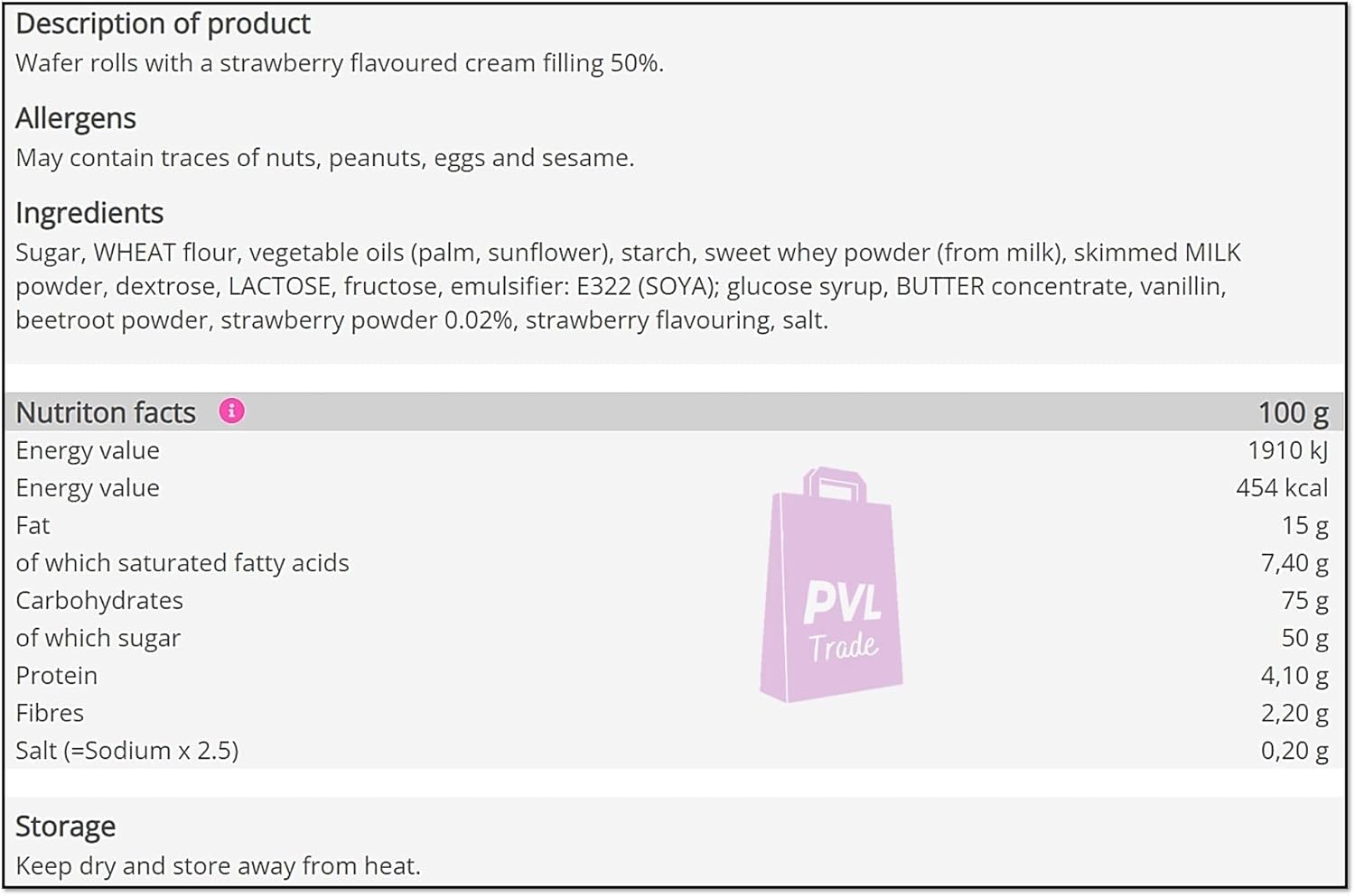 Allergens: May contain traces of nuts, peanuts, eggs and sesame. Ingredients: Sugar, WHEAT flour, vegetable oils (palm, sunflower), starch, sweet whey powder (from milk), skimmed MILK powder, dextrose, LACTOSE, fructose, emulsifier: E322 (SOYA); glucose syrup, BUTTER concentrate, vanillin, beetroot powder, strawberry powder 0.02%, strawberry flavouring, salt. Nutriton facts -100 g: Energy value - 1910 kJ Energy value- 454 kcal Fat - 15 g of which saturated fatty acids- 7.40 g Carbohydrates - 75 g of which sugar - 50 g Protein - 4.10 g Fibres - 2.20 g Salt (=Sodium x 2.5) - 0.20 g Storage Keep dry and store away from heat.