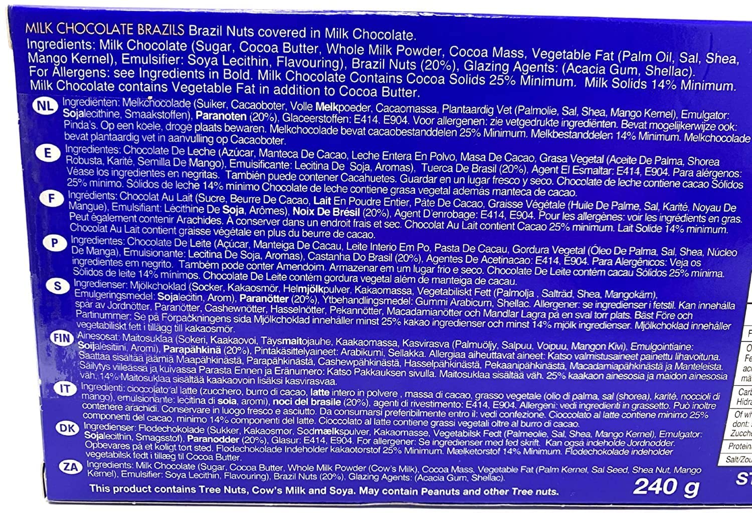 Ingredients: Milk Chocolate (Sugar, Cocoa Butter, Whole Milk Powder, Cocoa Mass, Vegetable Fat (Palm Oil, Sal, Shea, Mango Kernel), Emulsifier: Soya Lecithin, Flavouring), Brazil Nuts (20%), Glazing Agents: (Acacia Gum, Shellac). Milk Chocolate Contains Cocoa Solids 25% Minimum. Milk Solids 14% Minimum. Milk Chocolate contains Vegetable Fat in addition to Cocoa Butter.